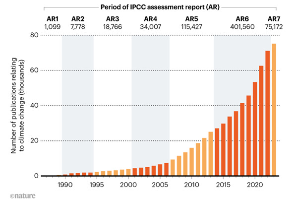L’un des principaux défis auxquels le GIEC est confronté est la croissance exponentielle de la littérature scientifique sur le changement climatique. La figure ci-dessous montre que le GIEC a identifié plus de 400 000 publications liées au changement climatique qui ont été publiées au cours du cycle d’évaluation du sixième rapport d’évaluation.