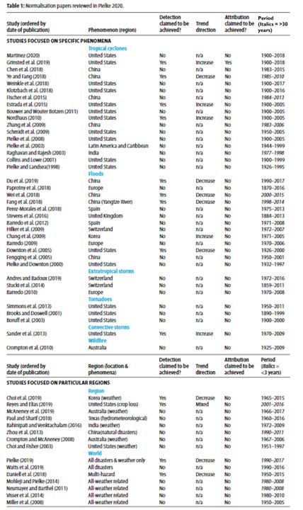 De manière plus générale, le GIEC a ignoré plus de cinquante autres études qui ont normalisé les pertes dues aux catastrophes, dont aucune — à l’exception de Grinsted et al. 2019, citée à plusieurs reprises par le GIEC — n’a prétendu avoir attribué les pertes normalisées dues aux catastrophes aux changements climatiques. Ces études sont répertoriées dans le tableau ci-dessous. Le parti pris est ici indéniable.