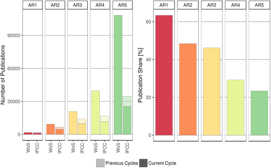 Le GIEC a récemment reconnu le défi posé par l’abondance et la croissance de la littérature : « Le volume des publications sur le changement climatique a augmenté de manière exponentielle, doublant quasiment à chaque cycle du GIEC. . . Cela pose des défis toujours plus grands aux équipes d’auteurs. » L’une des conséquences de cette littérature croissante est que de moins en moins de publications sont citées dans chaque évaluation.
