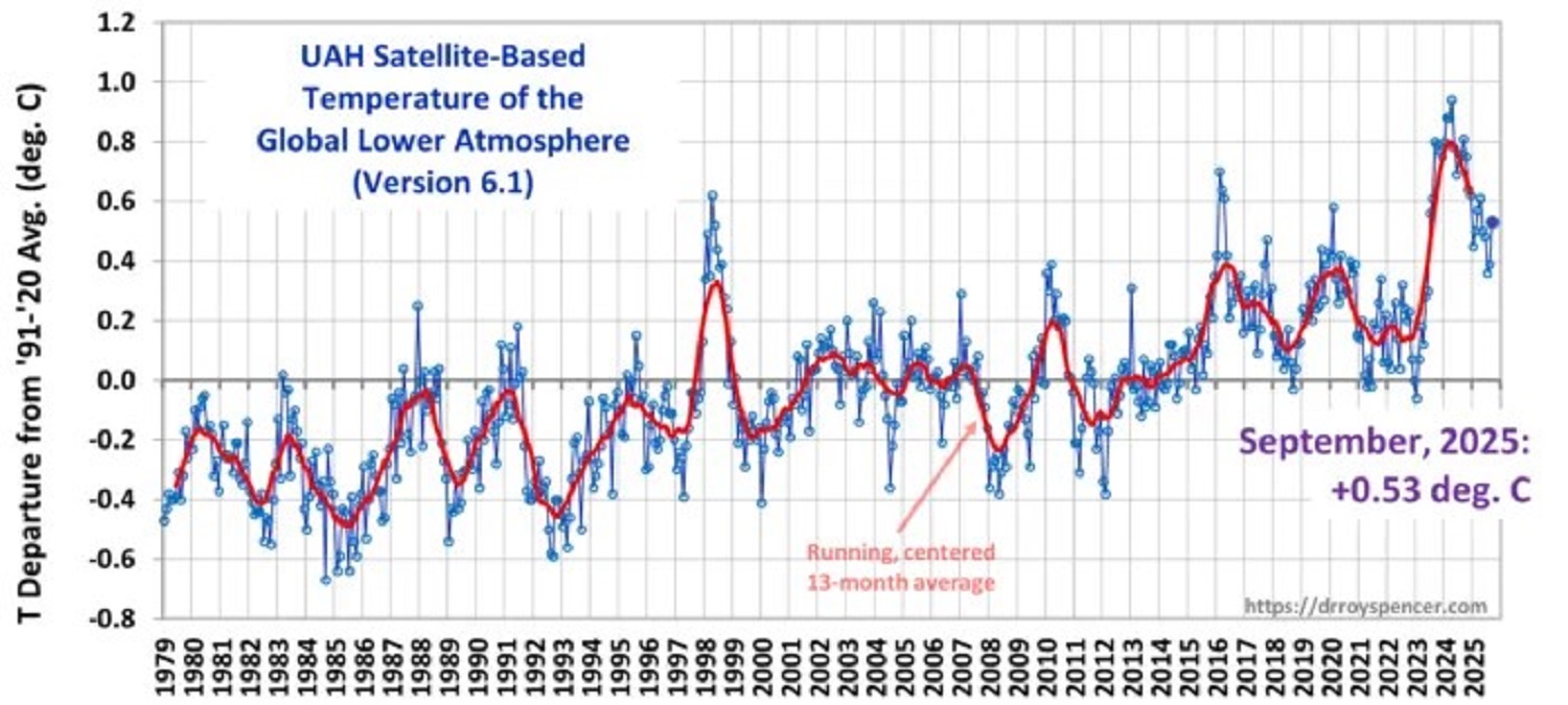 Les températures de septembre 2025 ont dépassé la moyenne à long terme de +0,53 °C. La tendance à long terme s’établit à +0,16 °C par décennie. (Dr Roy Spencer, Université de l’Alabama, Huntsville)