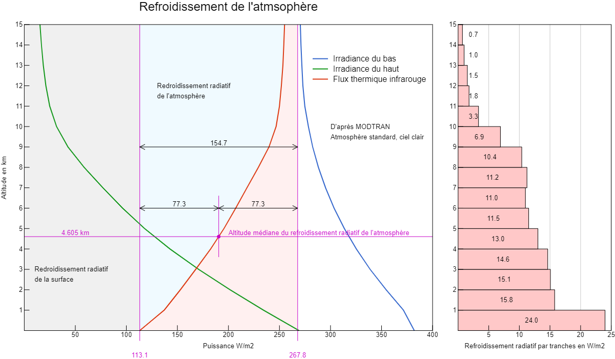 Ce graphique utilise les résultats de MODTRAN. Il ne présuppose rien sur la manière dont ils sont calculés. Pour une altitude donnée, MODTRAN donne l’irradiance du bas et l’irradiance du haut. Le flux thermique radiatif est la différence de ces deux irradiances. L’augmentation du flux thermique radiatif sur l’épaisseur de la tranche donne le refroidissement radiatif de cette tranche.