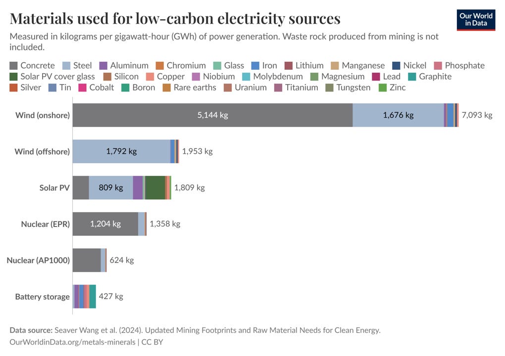 La production mondiale d’acier s’élève actuellement à environ 1,9 milliard de tonnes par an . Les éoliennes sont composées à 71-79 % d’acier (en masse) . La Commission sur les transitions énergétiques estime qu’une transition vers la neutralité carbone nécessitera 6,5 milliards de tonnes de matières premières entre 2022 et 2050, dont 95 % d’acier, de cuivre et d’aluminium – soit l’équivalent d’environ trois ans et demi de la production mondiale d’acier actuelle.
