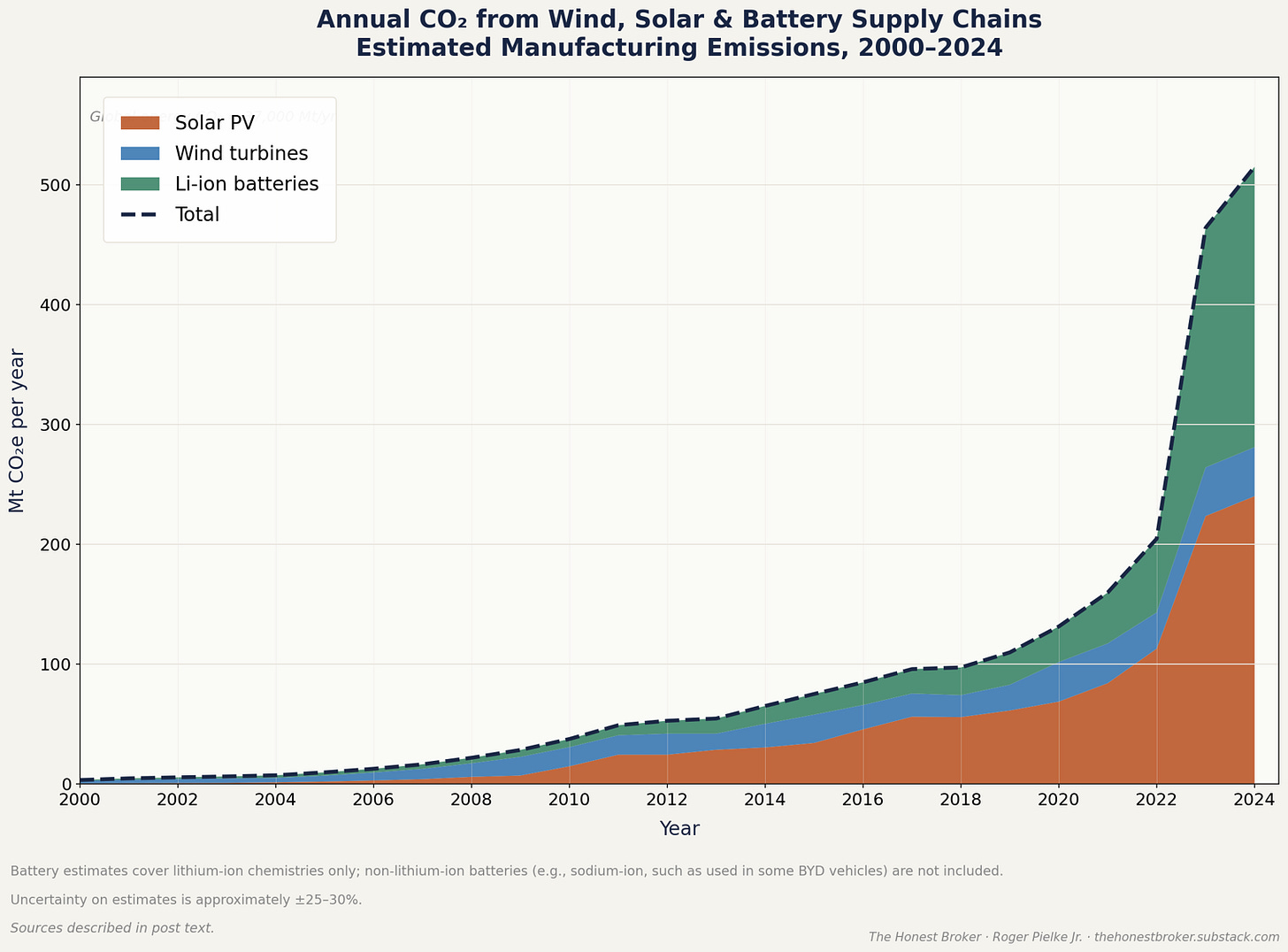 Le graphique ci-dessous présente une estimation des émissions de dioxyde de carbone (CO₂) liées aux chaînes d’approvisionnement pour la fabrication de nouvelles capacités éoliennes, solaires et de stockage par batteries. Les émissions annuelles sont passées d’environ 4 Mt en 2000 à environ 470 Mt en 2023, soit environ 1,3 % des émissions mondiales de CO₂ liées à l’énergie, un niveau comparable aux émissions annuelles totales de la Corée du Sud ou du Canada . Cette croissance est un pur effet de volume : l’intensité carbone de la fabrication par GW a considérablement diminué, mais les émissions absolues ont augmenté car le déploiement de ces technologies a progressé beaucoup plus rapidement que leur intensité n’a diminué.