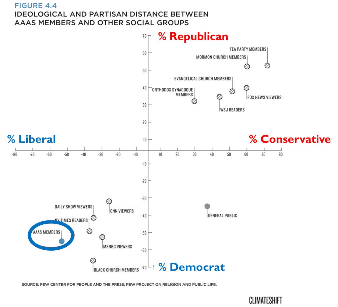 La figure ci-dessous, tirée du rapport de Nisbet, montre que les membres de l’AAAS se sont auto-déclarés être plus partisans et plus idéologiques que les téléspectateurs de Fox News à droite et les téléspectateurs de MSNBC à gauche.